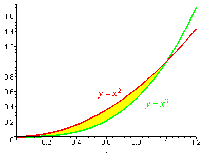 First we note that the curves intersect at the points (0,0) and (1,1).  Then we see that