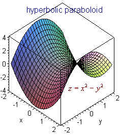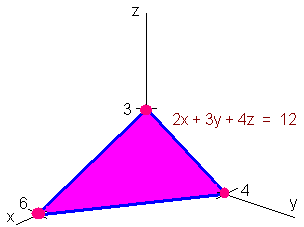 Example Graph 2x + 3y + 4z = 12 Solution We first set y and z equal to 0 to get the point (6,0,0) Similarly, we find the other two intercepts (0,4,0) and (0,0,3) Now plot the three points and connect the dots as shown in the picture below. Quadric Surfaces In the xy-plane the next step after studying lines is the study of conics: parabolas, ellipses, and hyperbolae. Their equations all have x2 or y2 terms or both. In three dimensions surfaces whose equations have only linear and quadratic terms are called quadric surfaces. The naming devise uses the suffix "-oid" to indicate that the surfaces has a trace in the shape of an ellipse. Note that a circle is a special ellipse. Below are names of some of these: