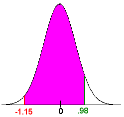 25.5 - 22.75 The table gives us corresponding probabilities .1251 and .8365 We want P(-1.15 < z < 0.98). The picture indicates that we need to subtract these probabilities. We get .8365 - .1251 = .7114 We can conclude that there is about a 71% chance that between 20 and 25 of the visitors will be from the Bay Area. B. Why is your estimate valid? We compute np and nq. We have np = 35(.65) = 22.75 nq = 35(.35) = 12.25 since both of these value are greater than 5, we can conclude that the distribution is approximately normal and our calculations are valid.