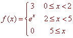 Solution We tackle the functions in parts. The function that is 1 from 0 to 2 and 0 otherwise is 1 - u2(x) Multiplying by 3 gives 3(1 - u2(x)) = 3 - 3u2(x) To get the function that is 1 between 2 and 5 and 0 otherwise, we subtract u2(x) - u5(x) Now multiply by ex to get ex(u2(x) - u5(x)) = ex u2(x) - ex u5(x) Adding these together gives f(x) = 3 - 3u2(x) + ex u2(x) - ex u5(x) = 3 + (ex - 3)u2(x) - ex u5(x)