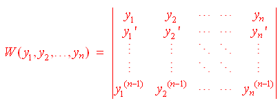 Solution We first divide by t to get y(iv) + 2/t y''' - ety'' + (t2 - 4)y' + t sin t y = 0 Now take the integral of 2/t to get 2ln t The Wronskian is thus c e2ln t = c t2