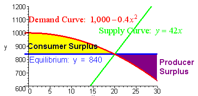 Let y = f(x) be the demand function for a product and y = g(x) be the supply function.  Then we define the equilibrium point to be the intersection of the two curves.  The consumer surplus is defined by the area above the equilibrium value and below the demand curve, while the producer surplus is defined by the area below the equilibrium value and above the supply curve.