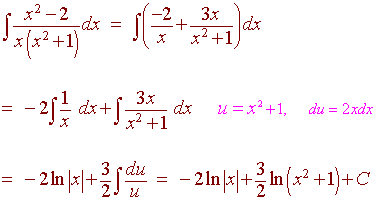 C Multiplying by the common denominator, we have A(x2 + 1) + (Bx + C)x = x2 - 2 Let x = 0 A = -2 Hence (Bx + C)x = x2 - 2 + 2x2 + 2 = 3x2 So that Bx2 + Cx = 3x2 We see that B = 3 and C = 0 Hence
