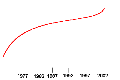 Problem 4 The annual revenue of the Tahoe Eats restaurant is pictured in the figure below. Visually locate the point of inflection. Interpret this point in terms of how revenue is increasing or decreasing. What can you say about the revenue growth of the restaurant over the last thirty years?