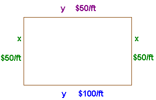A = xy and the cost is given by 3000 = 50y + 100y + 50x + 50x 100x + 150y = 3000 Solving for x gives 100x = 3000 - 150y Now dividing by 100 gives x = 30 - 1.5y Substitute into the area equation to get A = (30 - 1.5y)y = 30y - 1.5y2 Since we want the maximum area, we take a derivative to get A' = 30 - 3y Setting the derivative equal to zero gives 30 - 3y = 0 y = 10 The first derivative test shows that this is a maximum since A'(9) = 3 > 0 and A'(11) = -3 < 0 Now find x to get x = 30 - 1.5(10) = 15 We can say that the front and back of the cage should be 10 feet and the two sides should be 15 feet to maximize area.