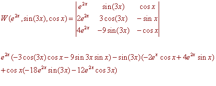 Solution First take derivatives y'1 = 2e2x y'2 = 3cos(3x) y'3 = -sin x y''1 = 4e2x y''2 = 9sin(3x) y''3 = -cos x The Wronskian is