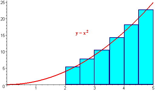 2.25 + 1(.5), 2.25 + 2(.5), 2.25 + 3(.5), 2.25 + 4(.5), 2.25 + 5(.5) (2.25 + 0(.5))2, (2.25 + 1(.5))2, (2.25 + 2(.5))2, (2.25 + 3(.5))2, (2.25 + 4(.5))2, (2.25 + 5(.5))2 We see that the ith rectangle has y-coordinate: height = (2.25 + i(.5))2 To get the area of the ith rectangle we multiply the height by the base: (2.25 + i(.5))2(.5) Finally to get the total area we add the terms up: