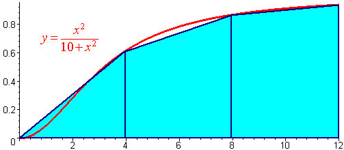The x values of interest are x0 = 0, x1 = 4, x2 = 8, x3 = 12 Plugging in these values into the function gives f(0) = 0, f(4) = 0.6154, f(8) = 0.8649, f(12) = 0.9351 The trapezoid approximation formula gives
