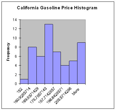 The histograms, like the line graph, show the volatility in the price of gasoline in California. The California histograms bars represent a fairly wide range in price and there is high frequency at just about each price. The New York histogram is somewhat skewed right.