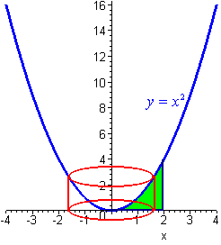 If instead of taking a cross section perpendicular to the y-axis, we take a cross section perpendicular to the x-axis, and revolve it about the y-axis, we get a cylinder.  Recall that the area of a cylinder is given by: