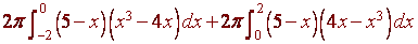 C) (10 Points) Find the volume of the solid that is formed by revolving the region bounded by y = x3 - x and y = 3x around the line x = 5. Solution
