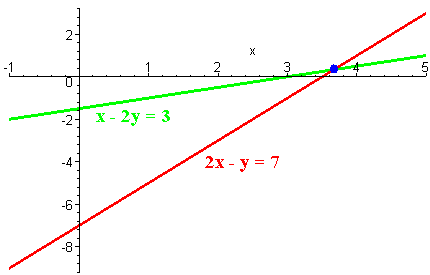 The point of intersection looks like it has coordinates approximately (3.7,0.5).  This is only an estimate.  The next section will show us how to find the exact solution
