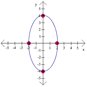 y2 Now we can sketch the graph. Notice that 16 is larger than 4 so we let a be the square root of 16 and b be the square root of 4. We have a = 4 and b = 2 We plot the vertices (0,4), (0,-4), (2,0), and (-2,0) and connect the vertices with a conic as shown to the right.