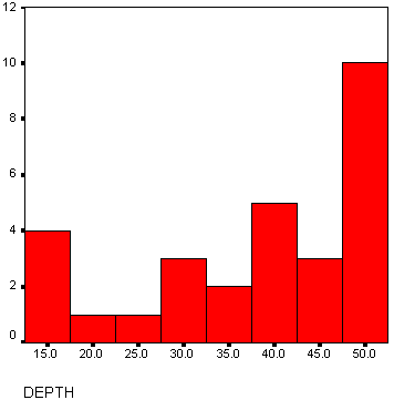 Histograms are bar graphs whose vertical coordinate is the frequency count and whose horizontal coordinate corresponds to a numerical interval. Example: The depth of clarity of Lake Tahoe was measured at several different places with the results in inches as follows: 15.4, 16.7, 16.9, 17.0, 20.2, 25.3, 28.8, 29.1, 30.4, 34.5, 36.7, 39.1, 39.4, 39.6, 39.8, 40.1, 42.3, 43.5, 45.6, 45.9, 48.3, 48.5, 48.7, 49.0, 49.1, 49.3, 49.5, 50.1, 50.2, 52.3