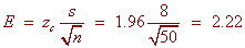 Problem 8 The manager of Wasabi restaurant tallied the number of customers that he received over a 50 day period. He found that the mean number per day for this period was 45 with a standard deviation of 8. Construct a 95% confidence interval for the true mean. Write a sentence that explains your findings. We find the margin of error first. We have x = 45 s = 8 z.95 = 1.96 n = 50 We have