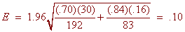 Problem 12 A study was done to compare the pass rates of Caucasians and Latinos in their statistics class. 192 Caucasians and 83 Latinos were considered. 135 of the Caucasians and 70 of the Latinos passed the course. Find a 95% confidence interval for p1 - p2 and explain in a complete sentence what it means. We have p1 = 135/192 = .70 p2 = 70/83 = .84 n1 = 192 n2 = 83 We calculate