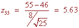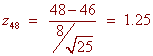The probability that corresponds with 1.25 is .8944. Notice that 5.63 is off the chart. Thus, the probability that corresponds with 5.63 is 1. Since we want the "in between" area, we take 1 - .8944 = .1056 We can conclude that there is about an 11% chance that the mean number of visits for these 25 children will be between 48 and 55.