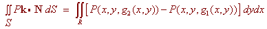 We have on the top surface Pk . N dS = Pk . ( (-g2)x i - (g2)y j + k) = P(x,y,g2(x,y)) On the bottom surface, we get Pk . N dS = Pk . ( (g1)x i + (g1)y j - k) = -P(x,y,g1(x,y)) Putting these together we get