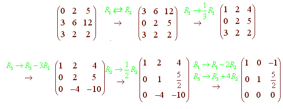 The A and B are in rref, while C is not. The main purpose of putting a matrix in rref is that this form makes the solution of the linear system easy to identify. For example A corresponds to the system x1 = 4 x2 = 2 x3 = x3 or in parametric form we get the line x1 = 4 x2 = 2 x3 = t B corresponds to the system x1 + 3x3 = 5 x2 - x3 = 0 x3 = x3 This also gives us a line. In parametric form it is x1 = 5 - 3t x2 = t x3 = t Row Operations and RREF We saw awhile back that the three row operation do not effect the solution space of a system of linear equations. We restate the row operations here for convenience: Three Elementary Row Operations