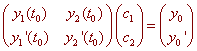 Next, we investigate the initial conditions. If we find a general solution to the homogenous system, can we choose constants such that the solution satisfies the initial conditions? That is can we find c1 and c2 such that c1y1(t0) + c2y2(t0) = y0 c1y1'(t0) + c2y2'(t0) = y0' We can put this into a matrix equation