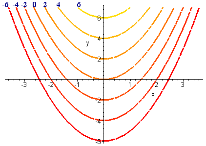 We see that each topo line is a parabola and that the y-intercept gives the height. Below is a contour diagram of this function. Names for the curves drawn are level curves, isotherms (for temperature), isobars (for pressure), and equipotential lines (for electric potential fields) depending on what the two variable function represents.