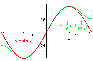 approximates y = sin x (in red) for on period.