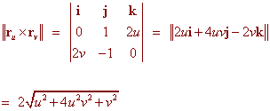 Solution We have ru(u,v) = (2u) i + j + v k rv(u,v) = (-2v) i + j + u k so that ru(1,2) = 2 i + j + 2 k rv(1,2) = -4 i + j + k r(1,2) = -3 i + 3 j + 2 k Now cross these vectors together to get