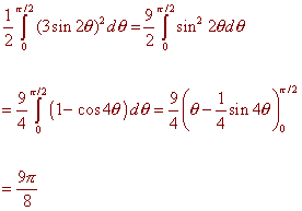 PROBLEM 5 (21 Points) Determine the area of the first quadrant loop of r = 3sin(2q) The first loop occurs from the first time the radius equals 0 to the second time it equals 0. 0 = 3sin(2q) q = 0 and q = p/2 Now integrate