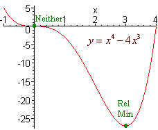 Example Let f(x) = x4 - 4x3 Then f '(x) = 4x3 - 12x2 which is zero at x = 0 and x = 3 f ''(x) = 12x2 - 24x f ''(0) = 0 and f ''(3) > 0 Hence at x = 3 there is a relative minimum. At x = 0 we use the first derivative test. To the left of 0: f '(x) < 0 To the right of 0: f '(x) <0 thus at x = 0 there is no local extrema. The graph is pictured below