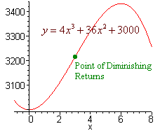 Solution We take two derivatives R '(x) = -12x2 + 72x R ''(x) = -24x + 72 Setting the second derivative equal to zero gives -24x + 72 = 0 x = 3 is the point of diminishing returns. The graph is pictured below