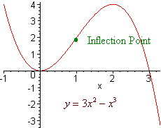 Example Let f(x) = 3x2 - x3 Then f '(x) = 6x - 3x2 and f ''(x) = 6 - 6x Solving 6- 6x > 0 we see that the function is concave up when x <1 Solving 6- 6x < 0 we see that the function is concave down when x > 1 When x = 1 we say that f(x) has an inflection point. Below is a sketch of f(x)