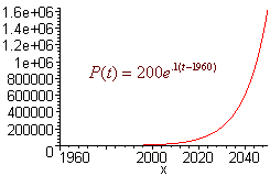 Solution We let t = 0 correspond to the year 1960. Then C0 = 200. The exponential growth model gives P = 200 e0.1t Next, 2050 corresponds to t = 90. So that P(90) = 200 e(0.1)(90) = 1,620,616 There will be 1,620,616 of these foreign plants by the year 2050. The graph is shown below.