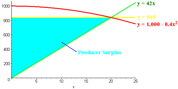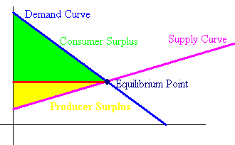 Application Let y = f(x) be the demand function for a product and y = g(x) be the supply function. Then we define the equilibrium point to be the intersection of the two curves. The consumer surplus is defined by the area above the equilibrium value and below the demand curve, while the producer surplus is defined by the area below the equilibrium value and above the supply curve.