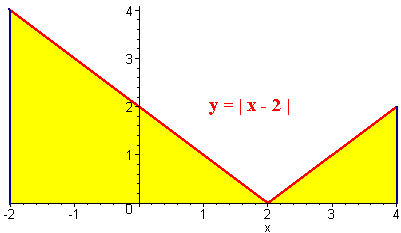 Example: Find the area under the curve y = | x - 2 | between x = -2 and x = 4