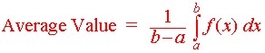 The Average Value We think of the average as the sum over the total. We will see later on that the definite integral is actually a sum. The total will be b - a. This leads us to a definition of the average value of f(x) between a and b as