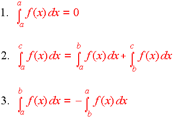 Properties of the definite integral Thinking of the definite integral as the area under the curve leads to some properties that we will use from time to time. If a and b are equal, then the length of the base is zero. The area of a figure with zero width is zero. This leads to the first property. Secondly, if we cut the region into two pieces, one going from a to b and the other going from b to c, then the total area is the sum of the first two areas. This leads to the second property. If we think of area in terms of antiderivatives, then F(b) - F(a) = -(F(a) - F(b)) This suggests that if we go from b to a instead of from a to b, we have the same definite integral except with a negative attached. This leads to the third property. We state these properties now.
