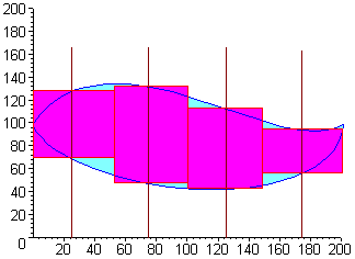 Solution To approximate this volume we cut the interval [0,200] into four equal pieces. [0,50] [50,100] [100,150] and [150,200] Then sketch the four rectangles with verticals coming from the midpoints as in the picture below.