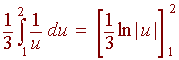Now we just plug in the numbers 2 and 1. Notice that there is no " + C" since it is a definite integral. We also do not need to resubstitute since the numbers already represent "u" values. Plugging in gives 1/3 ( ln 2 - ln 1) = 1/3 ln 2