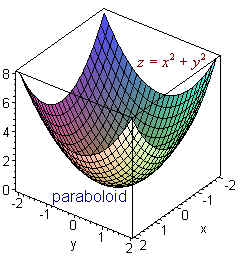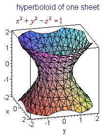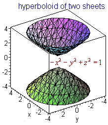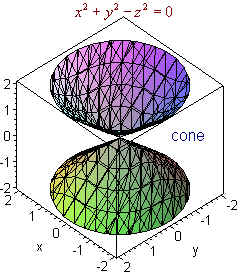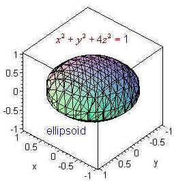 Example Graph 2x + 3y + 4z = 12 Solution We first set y and z equal to 0 to get the point (6,0,0) Similarly, we find the other two intercepts (0,4,0) and (0,0,3) Now plot the three points and connect the dots as shown in the picture below. Quadric Surfaces In the xy-plane the next step after studying lines is the study of conics: parabolas, ellipses, and hyperbolae. Their equations all have x2 or y2 terms or both. In three dimensions surfaces whose equations have only linear and quadratic terms are called quadric surfaces. The naming devise uses the suffix "-oid" to indicate that the surfaces has a trace in the shape of an ellipse. Note that a circle is a special ellipse. Below are names of some of these: