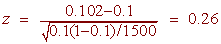 Since we are using a 95% level of significance with a one tailed test, we have zc = 1.645. The rejection region is shown in the picture. We see that 0.26 does not lie in the rejection region, hence we fail to reject the null hypothesis. We say that there is insufficient evidence to make a conclusion about the percentage of infested pines being greater than 10%.