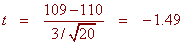 find that tc = 1.73 Since -1.49 > -1.73 We see that the test statistic does not fall in the critical region. We fail to reject the null hypothesis and conclude that there is insufficient evidence to suggest that the temperature required to damage a computer on the average less than 110 degrees.