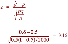 Notice that in this formula, we have used the hypothesized proportion rather than the sample proportion. This is because if the null hypothesis is correct, then .5 is the true proportion and we are not making any approximations. We compute the rejection region using the z-table. We find that zc = 2.33. The picture shows us that 3.16 is in the rejection region. Therefore we reject H0 so can conclude that the democratic candidate will win with a p-value of .0008.