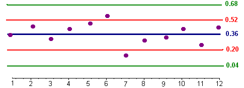 Notice that no nine consecutive points lie on one side of the blue line, no two of three points lie above 0.52 or below 0.20, and no points lie below 0.04 or above 0.68.  Hence this data is in control.