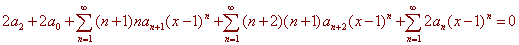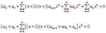 Now we can equate coefficients to find 2a2 + 2a0 = 0 (n + 1)nan+1 + (n + 2)(n + 1)an+2 + 2an = 0 The first equation says that a2 = -a0 The recursion relationship says