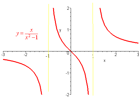 f(x) has a vertical asymptote at x = 1 and -1.