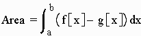 Area Between Two Curves I. Quiz II. Homework III. Area Between Two Curves Recall that the area under a curve and above the x axis can be computed by the definite integral. If we have two curves y = f(x) and y = g(x) such that f(x) > g(x) then the area between them bounded by the horizontal lines x = a and x = b is