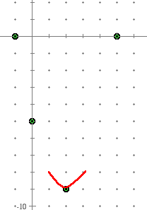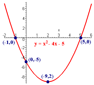 Step 4: Find the x-intercepts by setting y = 0 and factoring or quadratic formula. 0 = x2 - 4x - 5 (x - 5) (x + 1) = 0 x = 5 or x = -1 Step 5: If necessary, plug in more values of x to find a few additional points. (Here it is not needed since we already have four points: (2,-9), (0,-5), (5,0), (-1,0) If steps 1 through 4 produce fewer than 3 points, it is recommended to plot a few additional points. Step 6: Graph it!