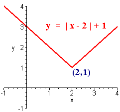 Example The graph of the function f(x) = |x - 2| + 1 Notice that the vertex is at the point (2,1) since the graph is shifted right 2 and up 1.