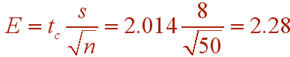 Problem 8 The manager of Wasabi restaurant tallied the number of customers that he received over a 50 day period. He found that the mean number per day for this period was 45 with a standard deviation of 8. Construct a 95% confidence interval for the true mean. Write a sentence that explains your findings. We find the margin of error first. We have x = 45 s = 8 z.95 = 1.96 n = 50 We have