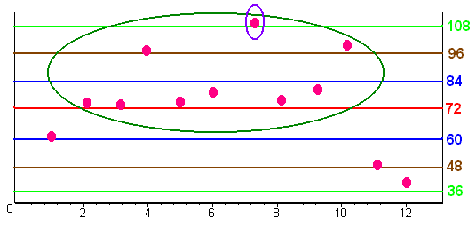 We first find m + s = 84 m + 2s = 96 m + 3s = 108 m - s = 60 m - 2s = 48 m - 3s = 36 Now we sketch the control chart